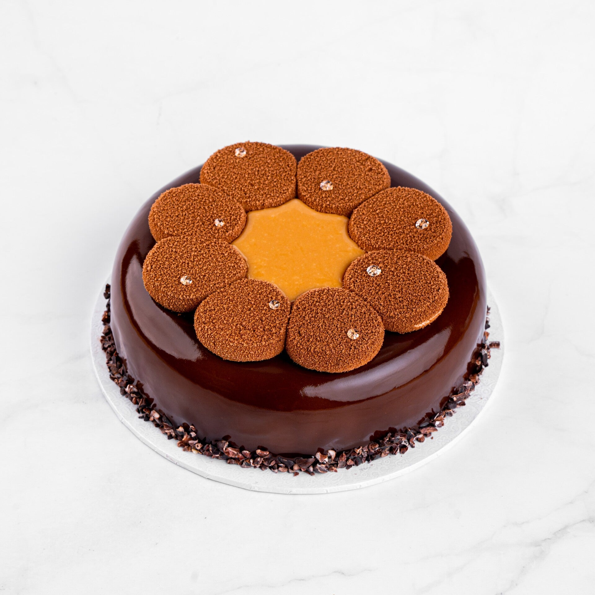 Chocolade biscuit, chocolade feuilletine, caramel crémeux, gezouten caramel, chocolade mousse, chocolade glazuur, chocolade ganache, cacao crumb