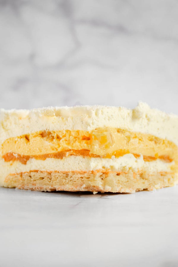 Amandelbiscuit, krokant kokos chocolade feuilletine, vanille mousse, mango en passievrucht crémeux, passievrucht confit